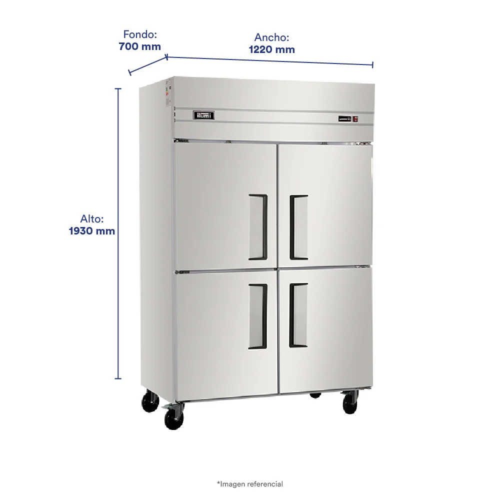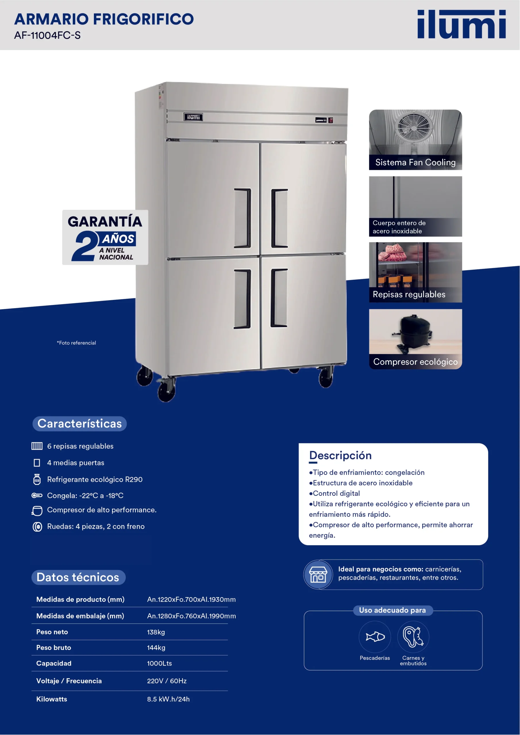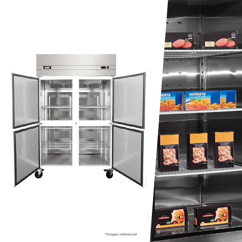 El Armario frigorífico congelador de 4 puertas Fan Cooling de 1000 litros AF-11004FC-S es un equipo esencial para la conservación de alimentos y bebidas en condiciones óptimas. Ofrece gran capacidad de almacenamiento, control de temperatura preciso y eficiencia energética.