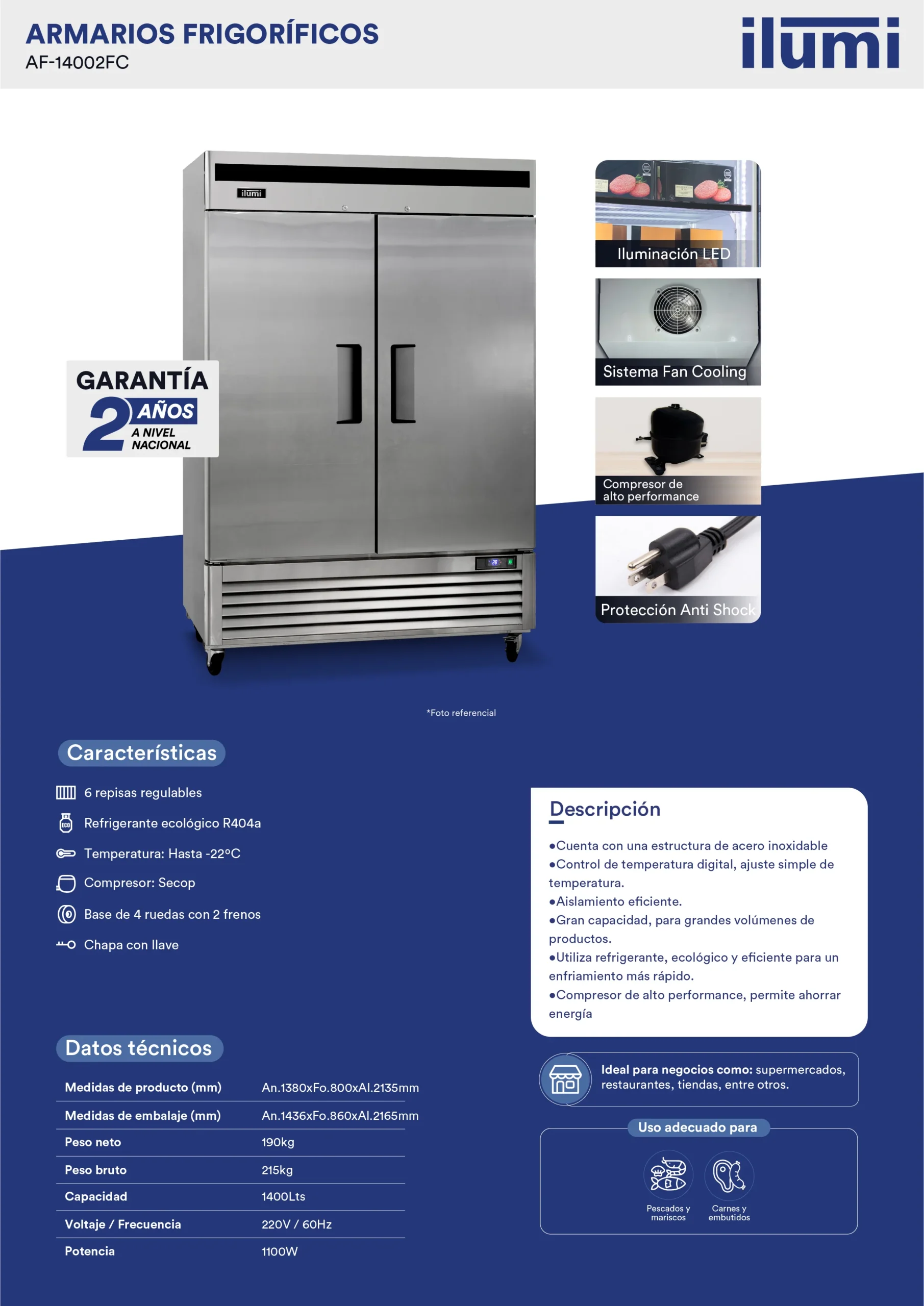 El Armario frigorífico congelador Fan Cooling de 1400 litros AF-14002FC Explora nuestro armario congelador de alta capacidad y eficiencia energética. Perfecto para almacenar grandes cantidades de alimentos con tecnología avanzada de congelación. Además, su sistema de frío forzado no genera escarcha ni humedad.