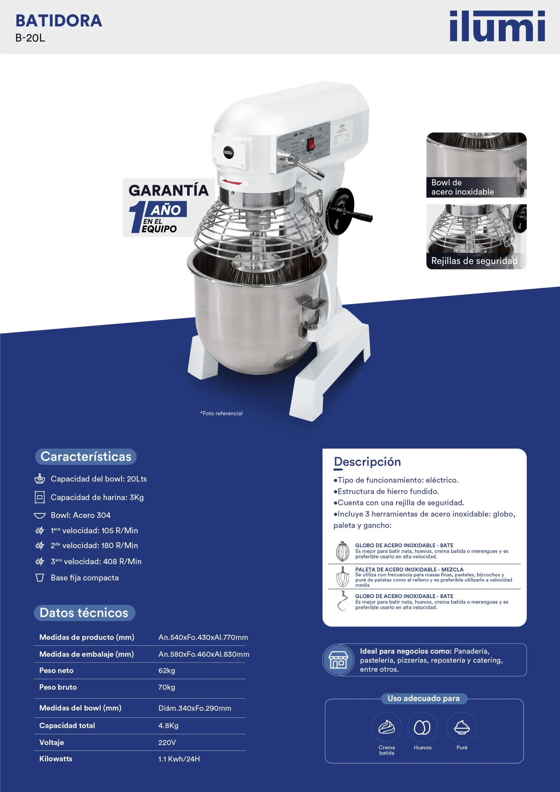 La Batidora industrial de 20L Mejora la eficiencia en tu cocina profesional con nuestras batidoras industriales de alto rendimiento. Diseñadas para manejar grandes volúmenes de ingredientes, estas batidoras son ideales para panaderías, reposterías, restaurantes, cocinas industriales y más.