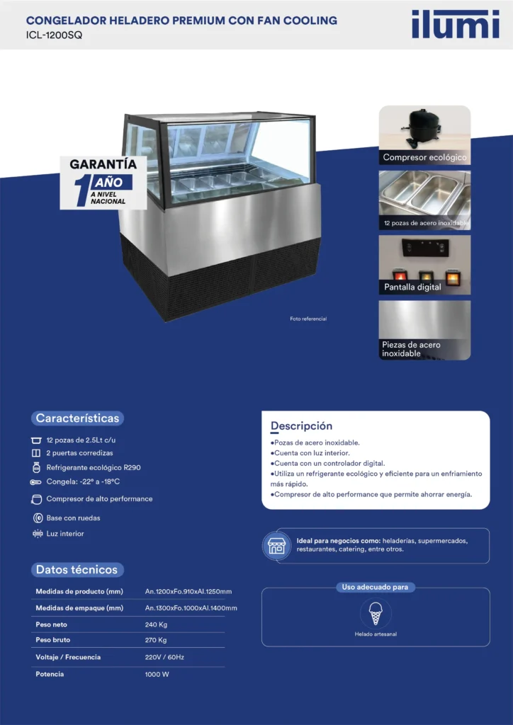 El congelador heladero premium es la elección perfecta para aquellos que buscan una solución de alta calidad para almacenar y exhibir helados de manera eficiente. Diseñado para mantener una temperatura constante que asegura la textura y el sabor de los helados.
