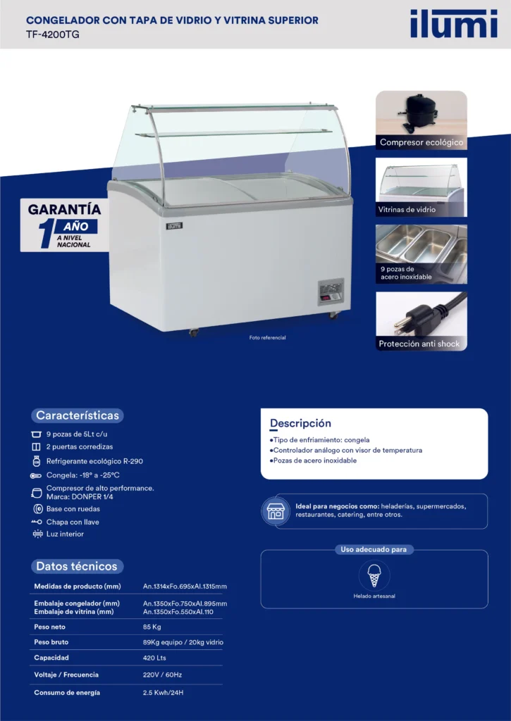 La Congeladora con 9 pozas y vitrina de 420lts TF-4200TG, asegura la conservación de tus productos congelados con nuestras congeladoras de alto rendimiento. Con un enfoque en la eficiencia energética y la durabilidad, nuestros congeladores ofrecen la solución perfecta para un almacenamiento seguro y confiable. Cotiza aquí con hasta 12 cuotas sin intereses.