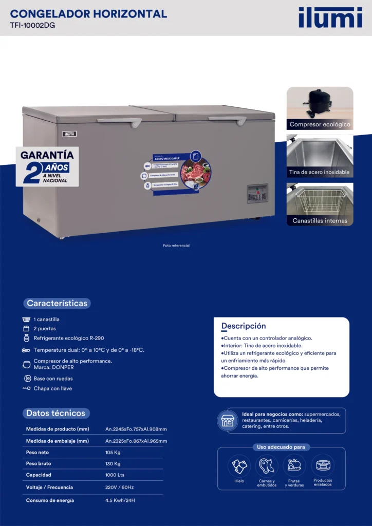 La Congeladora con Tina de Acero 1000lts TFI-10002DG asegura la conservación de tus productos congelados con nuestras congeladoras de alto rendimiento. Con un enfoque en la eficiencia energética y la durabilidad, nuestras congeladoras ofrecen la solución perfecta para un almacenamiento seguro y fiable. Cotiza aquí con hasta 12 cuotas sin intereses.