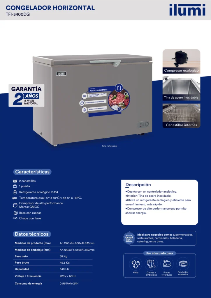 La Congeladora con Tina de Acero 340lts TFI-3400DG asegura la conservación de tus productos congelados con nuestras congeladoras de alto rendimiento. Con un enfoque en la eficiencia energética y la durabilidad, nuestras congeladoras ofrecen la solución perfecta para un almacenamiento seguro y fiable.
