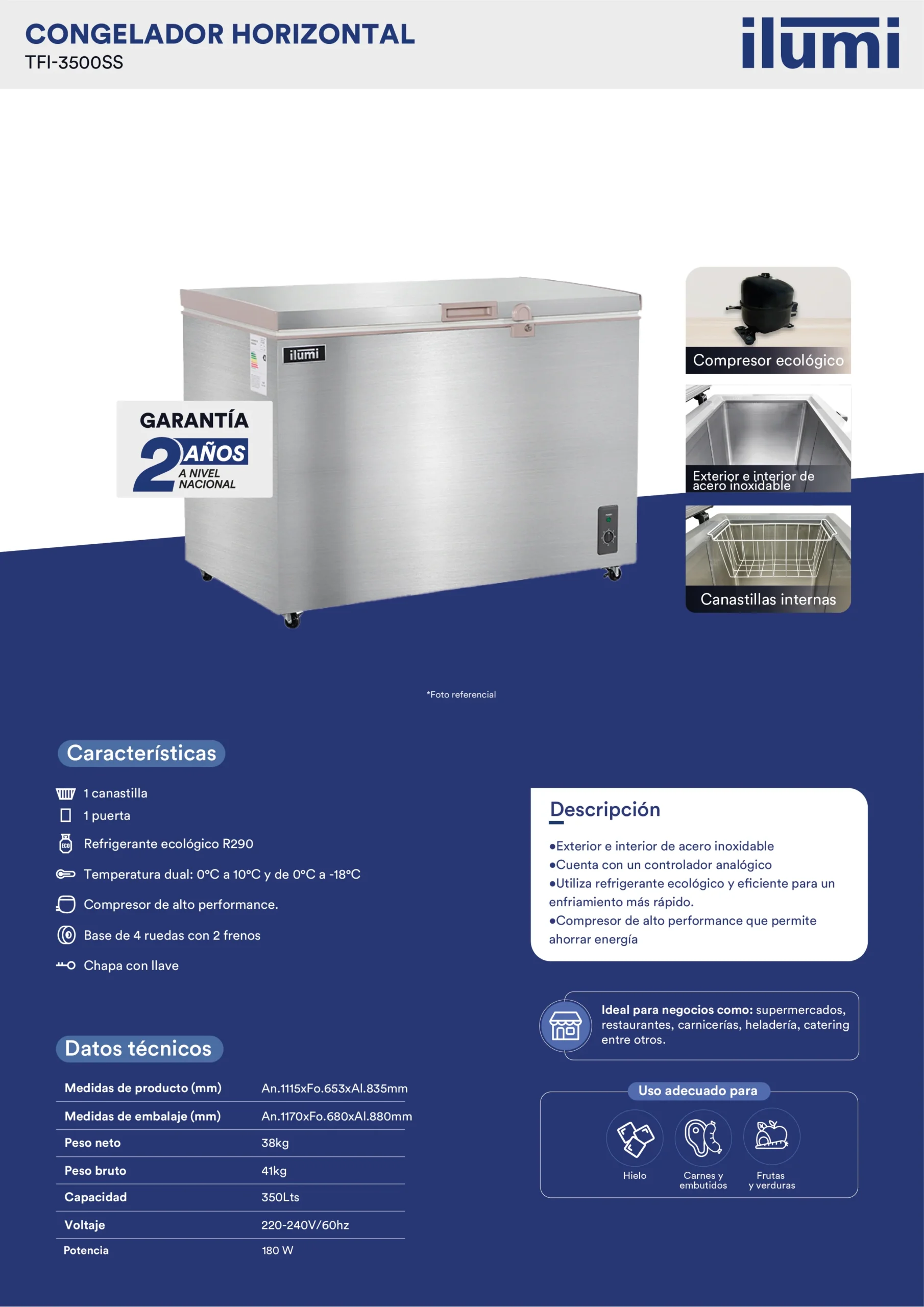 La Congeladora con tina y cuerpo de acero de 350lts TFI-3500SS asegura la conservación de tus productos congelados con nuestras congeladoras de alto rendimiento. Con un enfoque en la eficiencia energética y la durabilidad, nuestras congeladoras ofrecen la solución perfecta para un almacenamiento seguro y fiable.