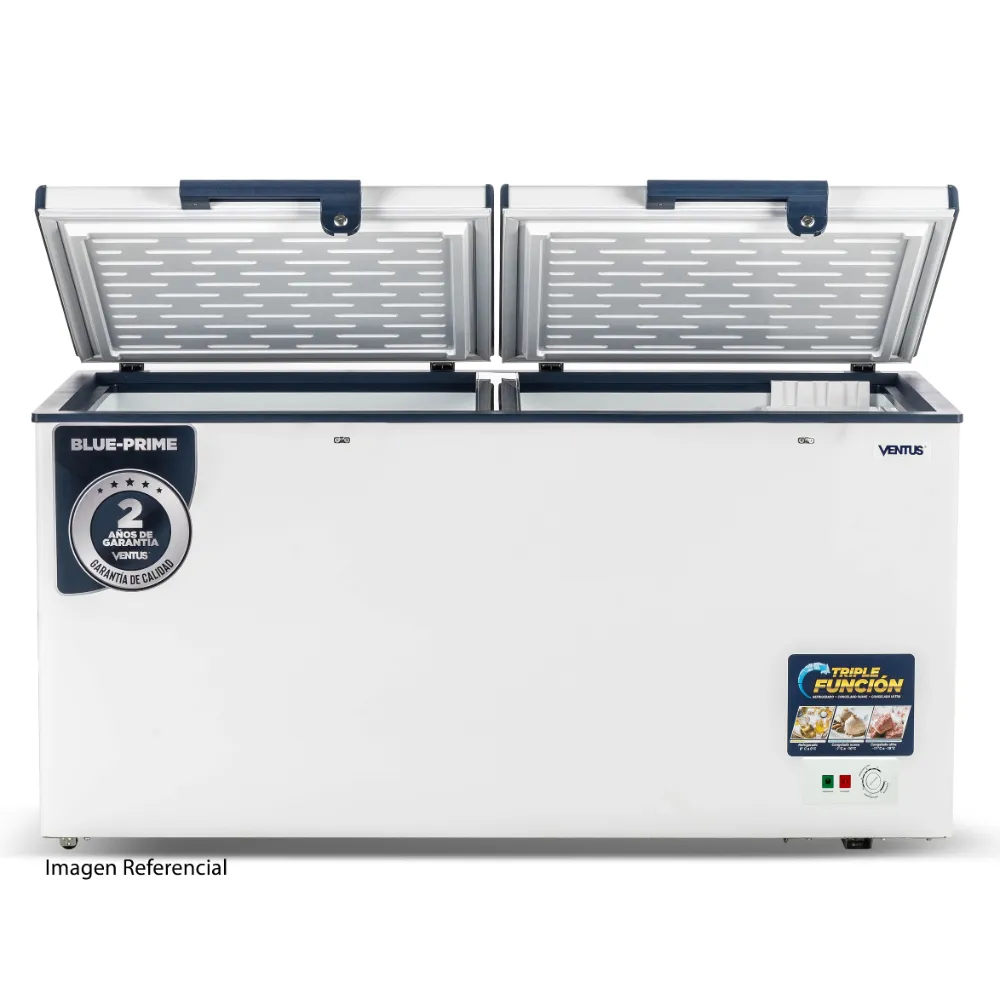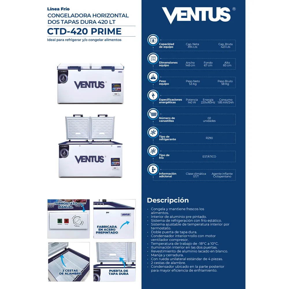 La Congeladora Ventus 420LT Tapa Dura CTD-420 Prime Garantiza la calidad y frescura de los productos de tu negocio con la nueva congeladora horizontal CTD-420 Prime de Ventus. Tiene un diseño versátil y resistente que se adapta a diferentes tipos de comercios, con una capacidad de 420 litros. Además, viene con refrigerante R290 y un sistema de enfriamiento estático que facilita la distribución del frío de manera natural, lo que previene la deshidratación y mantiene la frescura de los alimentos por más tiempo.