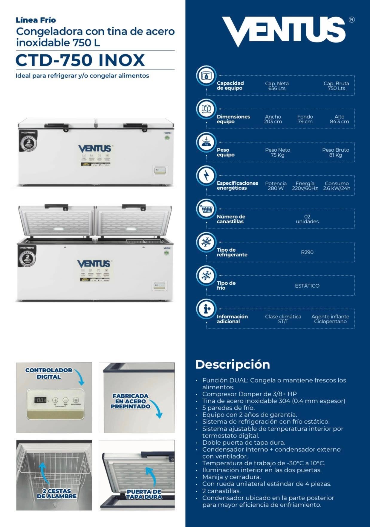 lA Congeladora Ventus 750LT Tapa Dura CTD-750 INOX Garantiza la calidad y frescura de los productos de tu negocio. Tiene un diseño versátil y resistente que se adapta a diferentes tipos de comercios, con una capacidad de 750 litros. Además, viene con refrigerante R290 y un sistema de enfriamiento estático que facilita la distribución del frío de manera natural, lo que previene la deshidratación y mantiene la frescura de los alimentos por más tiempo.