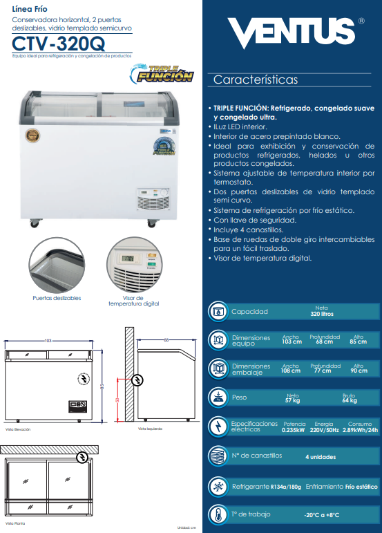 La Congeladora Ventus Tapa de Vidrio Curvo CTV-320Q PRO Conserva y exhibe tus productos con máxima versatilidad gracias a esta congeladora de triple función, diseñada para refrigerado, congelado suave y congelado ultra.