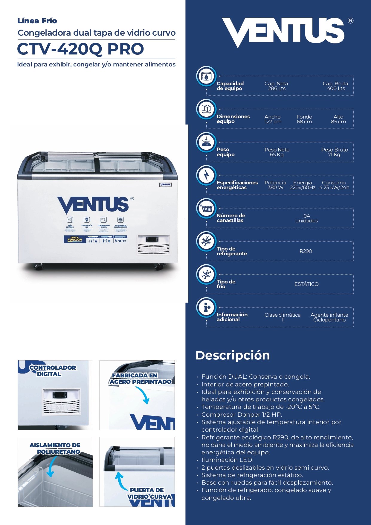 La Congeladora Ventus Tapa de Vidrio Curvo CTV-420Q PRO es ideal para negocios con alta demanda de almacenamiento de productos congelados o refrigerados.