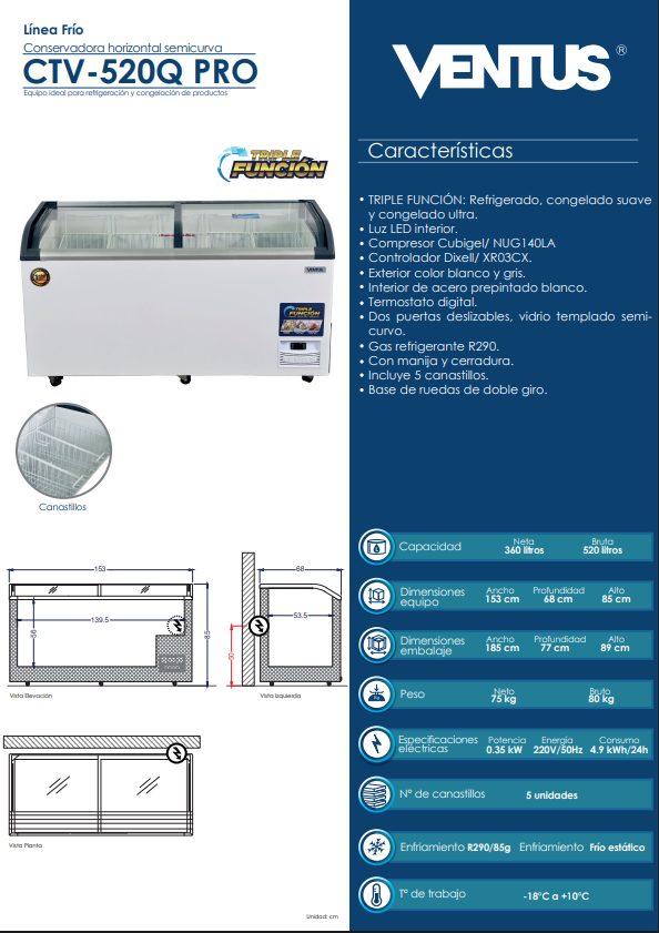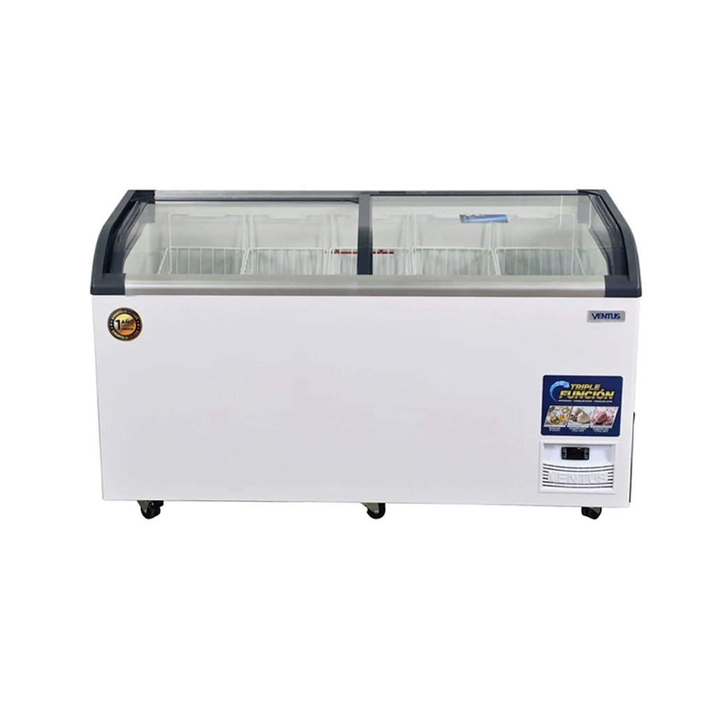 La Congeladora Ventus Tapa de Vidrio Curvo CTV-520Q PRO con una gran capacidad para almacenar productos congelados o refrigerados en espacios amplios.