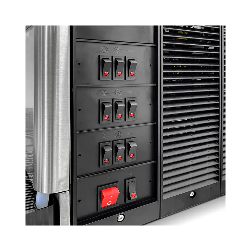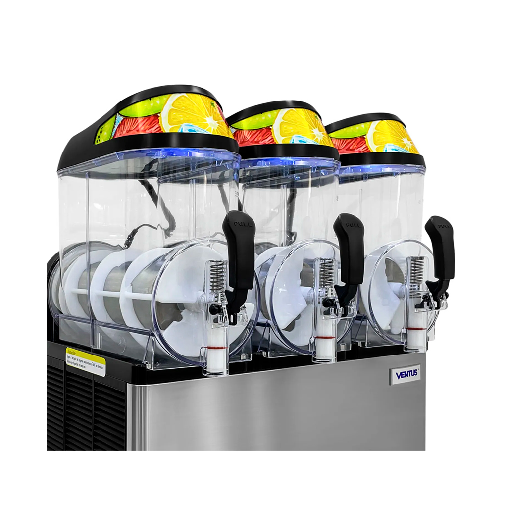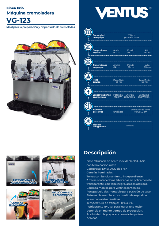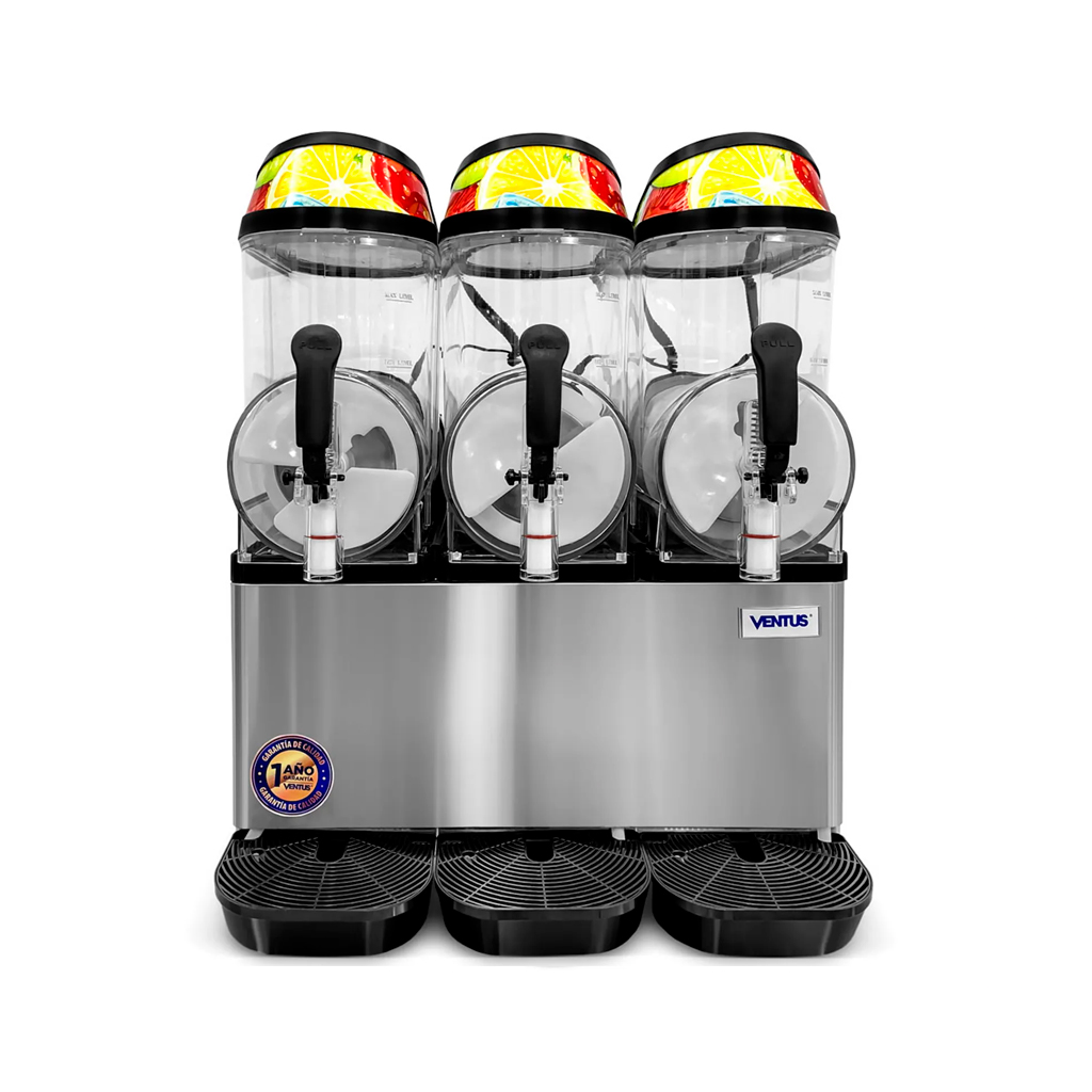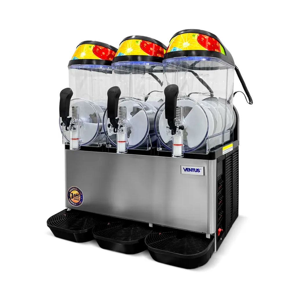 La Cremoladera de 3 tolvas de 12 Lts Vg-123 Ventus te trae el producto ideal para este verano, la cremoladera de 3 tolvas de 12 litros es ideal para aumentar las ventas de tu negocio. Sus características son: Ideal para la preparación y dispensado de cremoladas / 3 tolvas contenedoras fabricadas en policarbonato transparente, con tapa negra, ambos atóxicos / Refrigerante R404a, para lograr una mejor potencia en menor tiempo de producción. Cómoda manilla para vertir el contenido / Sistema de mezclado por medio de espiral de acero con aletas plásticas.