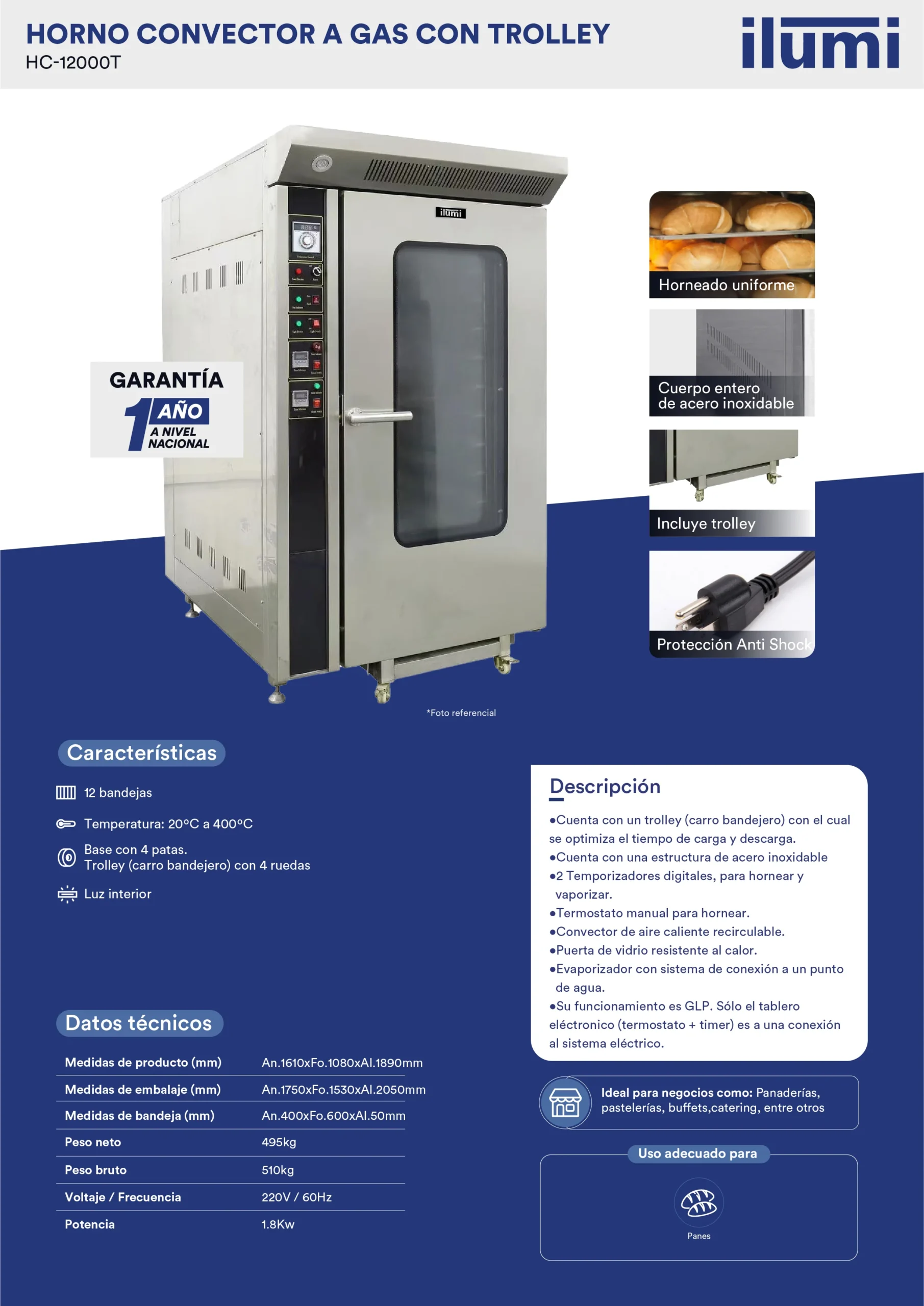 El horno convector a gas con carro trolley es la solución ideal para panaderías, pastelerías, restaurantes y cocinas industriales que necesitan gran capacidad de horneado, cocción uniforme y máxima eficiencia energética. Gracias a su sistema de convección y carro trolley extraíble, permite trabajar con múltiples bandejas a la vez, optimizando tiempo y productividad.