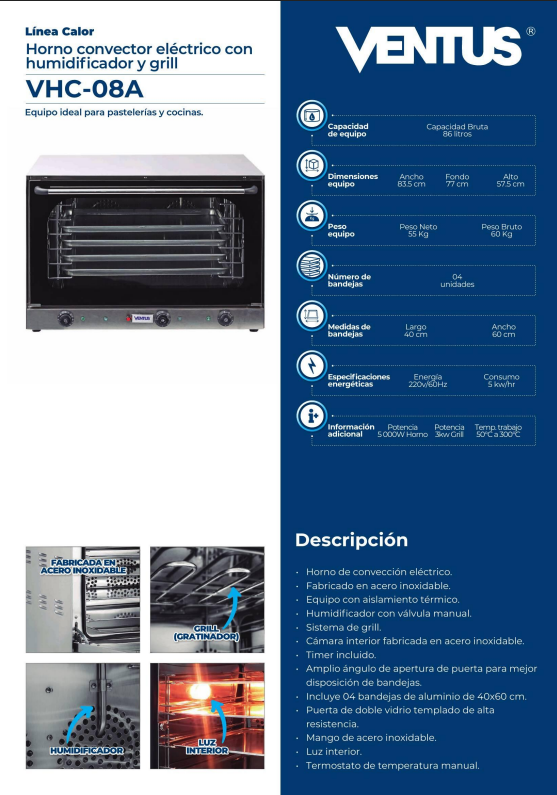 El Horno Convector Eléctrico con Grill y Humidificador VHC-08A – Ventus es un equipo de acero inoxidable con humidificador, grill, timer y 4 bandejas. Es ideal para cocinas comerciales y restaurantes que quieren cocinar platos sabrosos y variados con facilidad y rapidez.