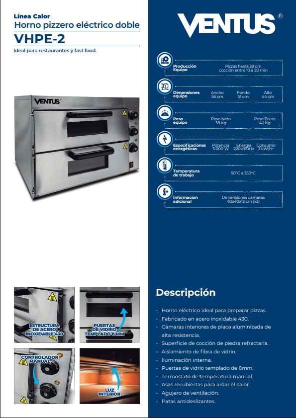 - Capacidad: Pizzas hasta 38 cm (por compartimiento), cocción entre 10 a 20 min