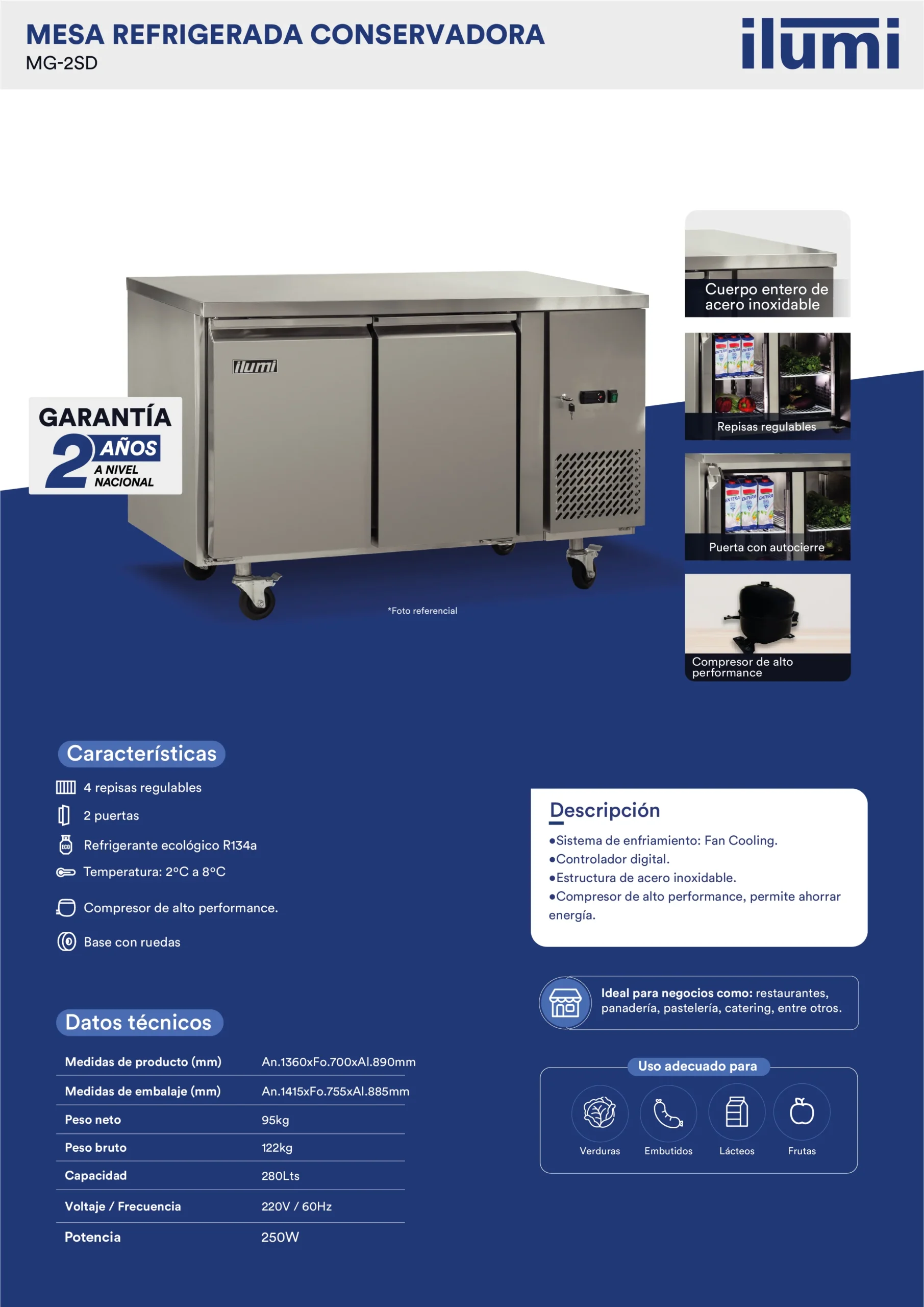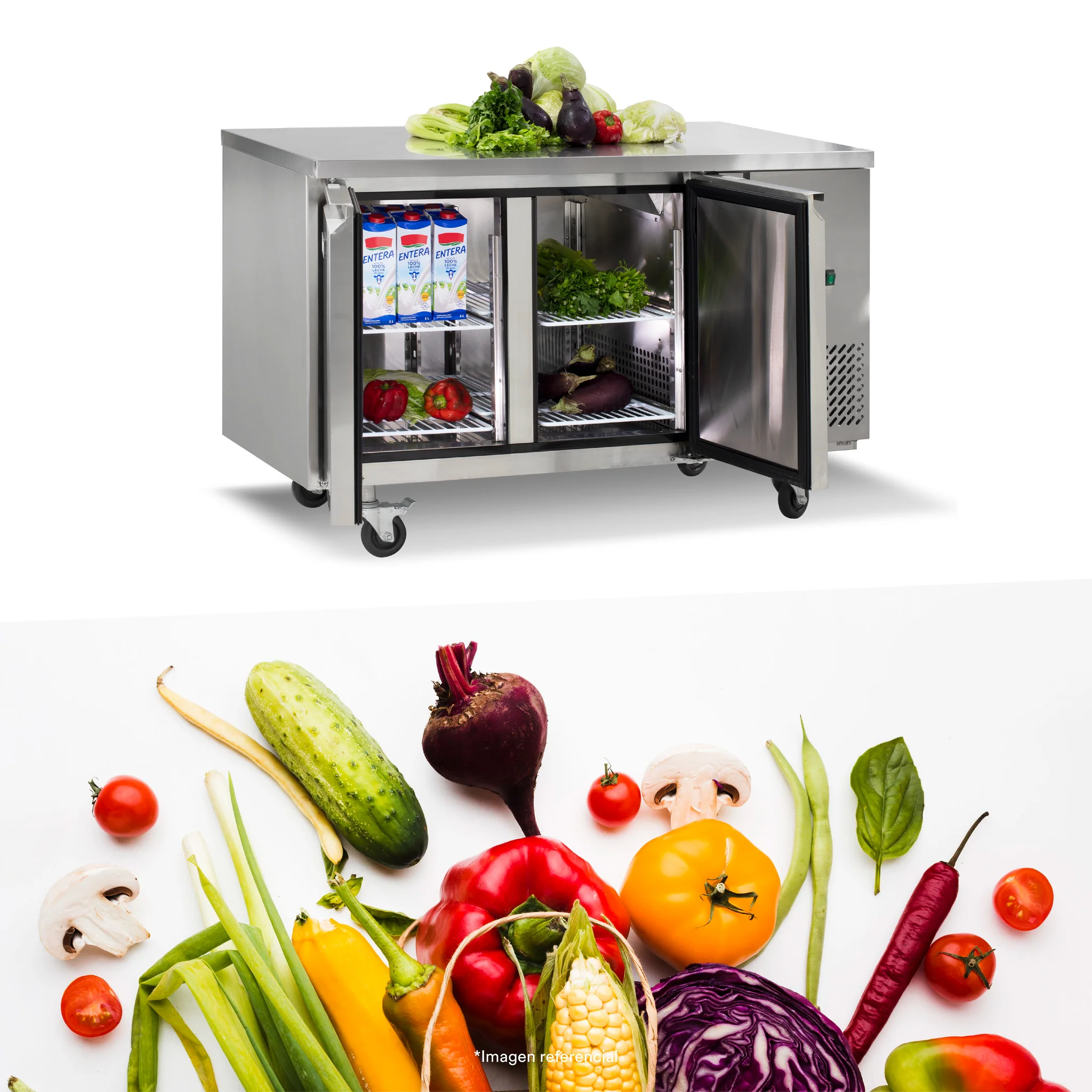 La Mesa refrigerada de 280 litros con 2 puertas sólidas es Ideal para cocinas profesionales, permite trabajar cómodamente arriba mientras refrigeras ingredientes abajo. Eficiencia y organización en un solo equipo.