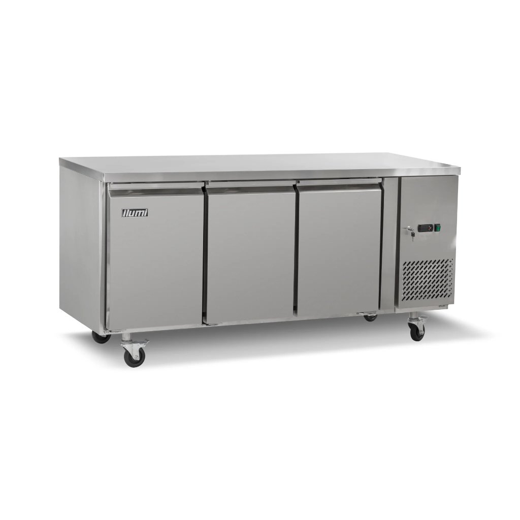 La Mesa refrigerada de 420 litros con 3 puertas sólidas es Ideal para cocinas profesionales, permite trabajar cómodamente arriba mientras refrigeras ingredientes abajo. Eficiencia y organización en un solo equipo.