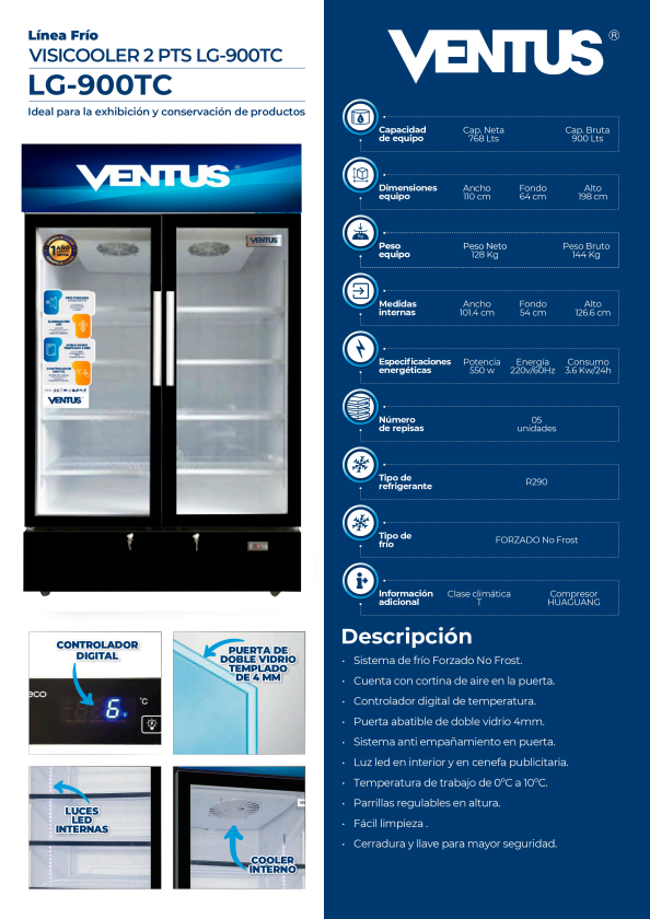 El Visicooler 2 puertas de 900Lts LG-900TC – Ventus es la mejor alternativa para hacer crecer tu almacén o minimarket, con su gran espacio interior de 900 litros de capacidad es ideal para exhibir y refrigerar productos envasados, bebidas, jugos y otros productos.