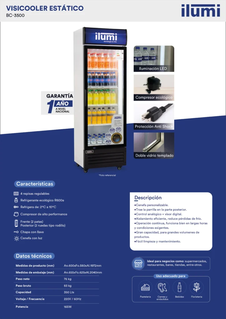 El Visicooler 350 litros con iluminación LED mantiene tus productos siempre frescos y exhibidos de manera atractiva con nuestro visicooler de alta eficiencia. Este equipo es perfecto para negocios que requieren refrigeración y visualización simultánea.