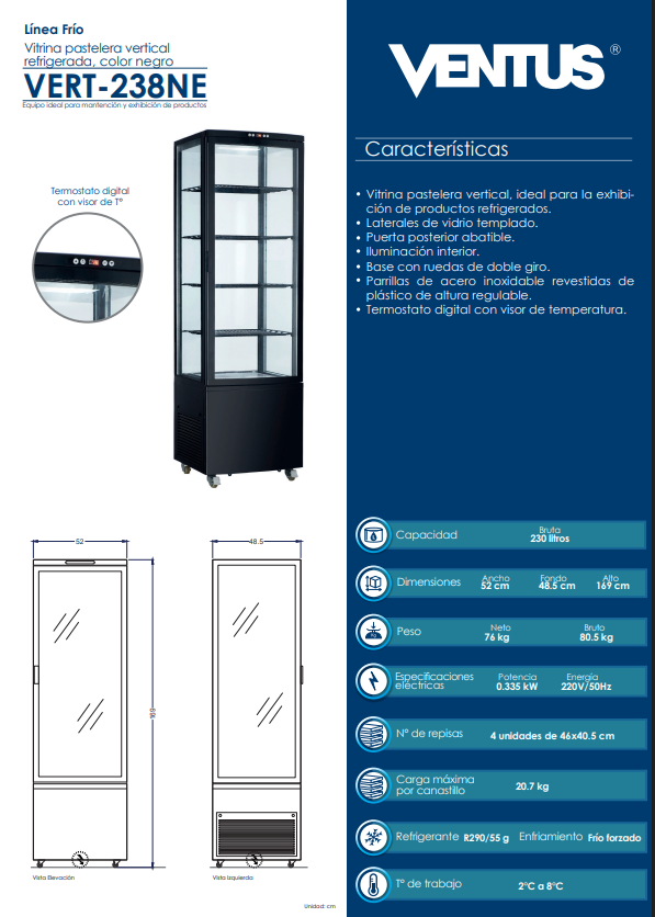 La Vitrina Refrigerada Vertical 230 Lts Vert-238NE – Ventus va más allá de ser un simple mueble de exhibición. Su diseño elegante y funcional resalta de manera atractiva y profesional tus deliciosos pasteles y postres. Nuestra vitrina pastelera vertical es perfecta para exhibir tus productos refrigerados de manera óptima. Equipada con un sistema de refrigeración por frío forzado, garantiza una temperatura uniforme y constante en todo el interior.
