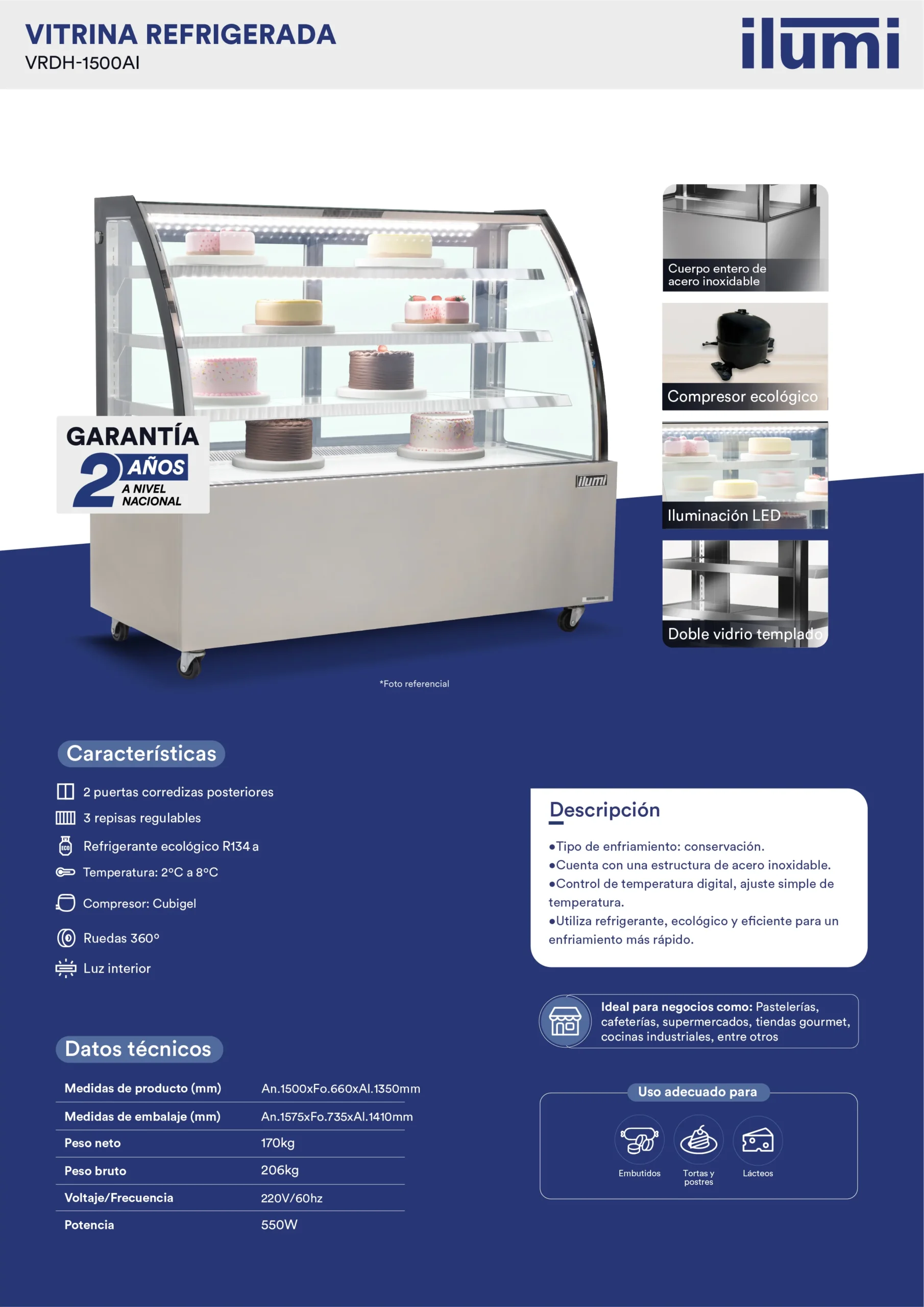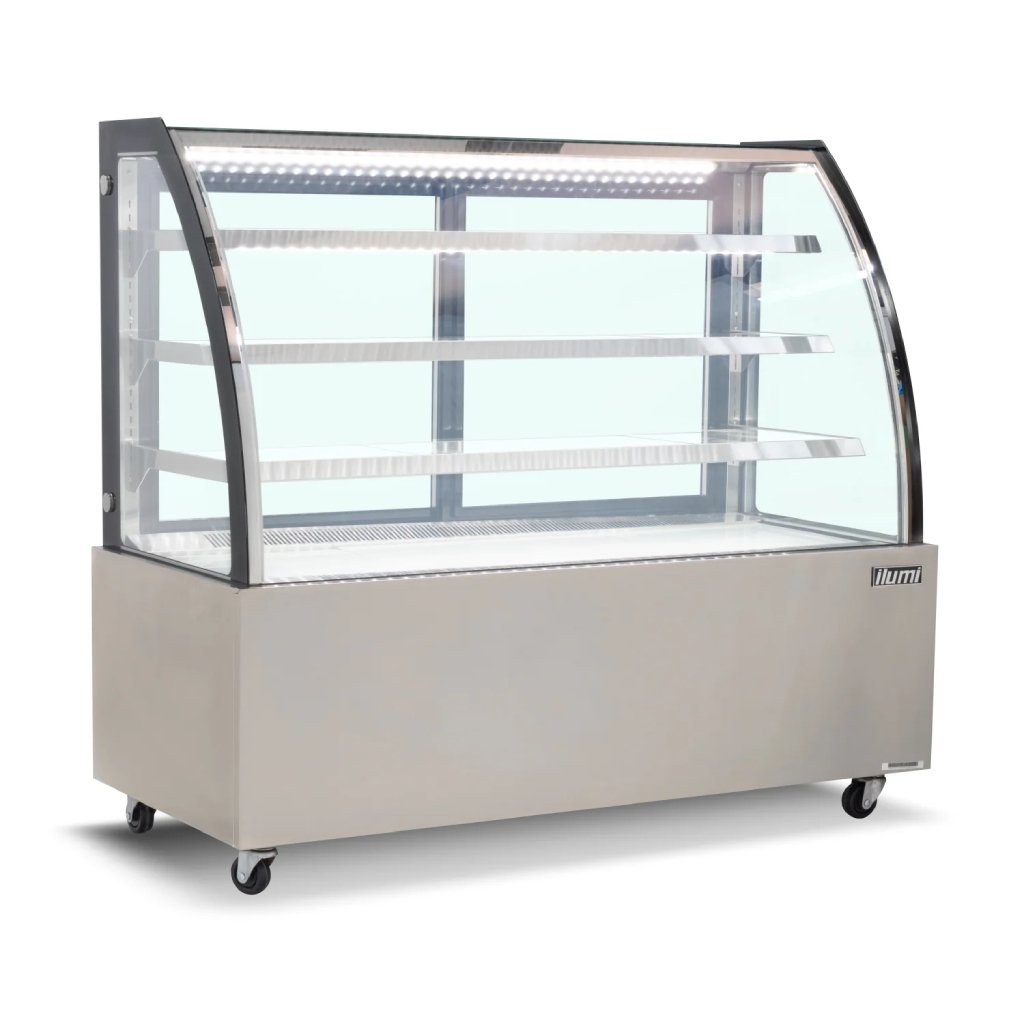 Con la Vitrina Refrigerada vidrio curvo VRDH-1500AI Conserva la frescura de tus productos y exhibe tus alimentos de manera atractiva con nuestra vitrina refrigerada. Diseñada para negocios que requieren una presentación impecable y una conservación óptima.